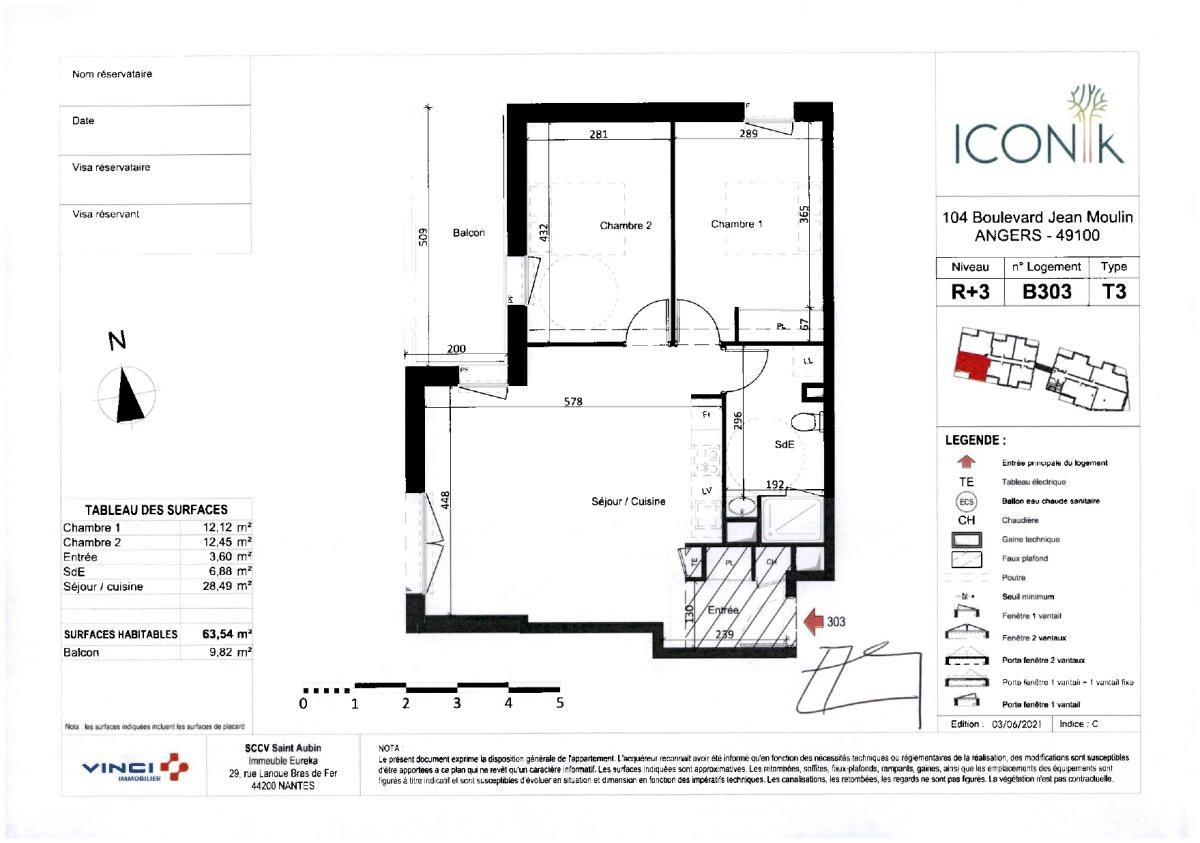 Une entrée, couloir, un salon ouvert sur cuisine aménagée-équipée, 2 chambres, une salle d'eau avec WC, un balcon de 10m2